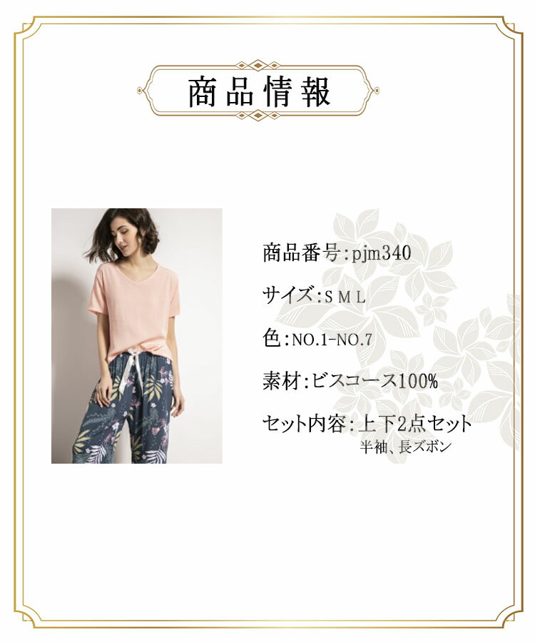 商品名:レディースパジャマ 半袖/長ズボン 上下2点セット ルームウエア 素材 カラー サイズ ビスコース100% (NO.1-NO.13) サイズ:S M L 生地の厚さ 透け感 伸縮性 普通 - - 生産国 セット内容 CHINA セット内容:上下2点セット 半袖、長ズボン 洗濯表示 平成28年12月から洗濯表示が変わりました 変更以前に生産された商品には旧洗濯表示が付いております。