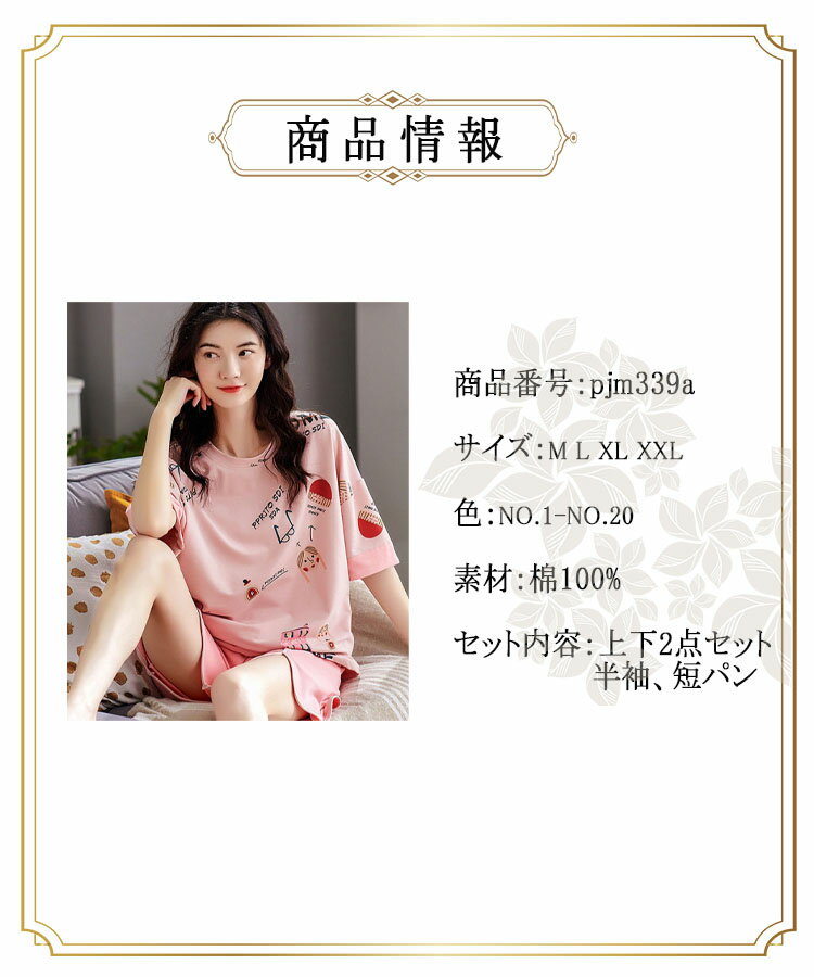 商品名:レディースパジャマ 半袖/短パン上下2点セット ルームウエア ナイトウエア 素材 カラー サイズ 棉100% (NO.1-NO.20) サイズ:M L XL XXL 生地の厚さ 透け感 伸縮性 普通 - - 生産国 セット内容 CHINA セット内容: 上下2点セット: 半袖、短パン 洗濯表示 平成28年12月から洗濯表示が変わりました 変更以前に生産された商品には旧洗濯表示が付いております。