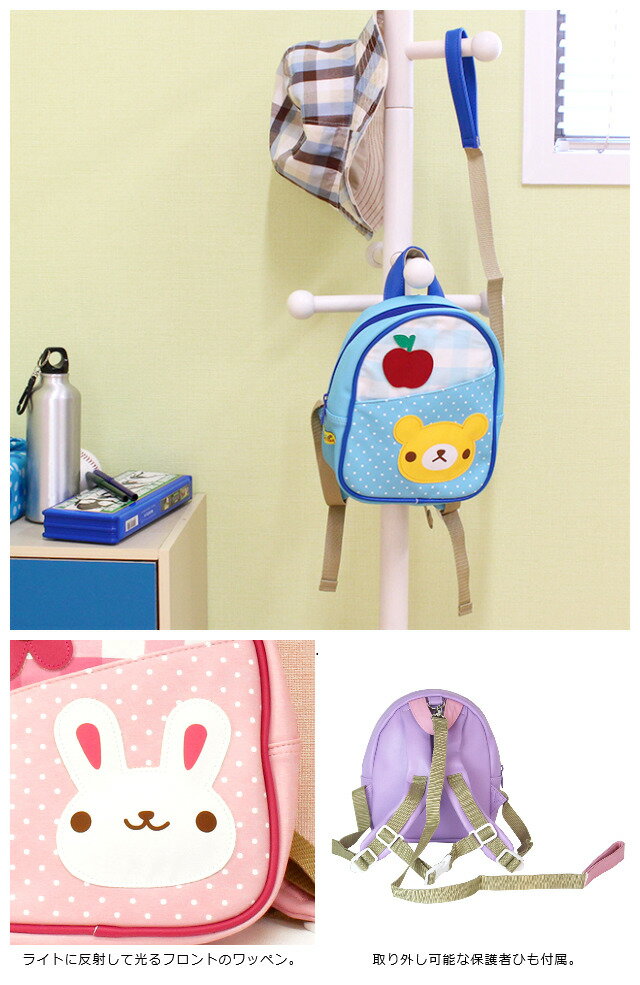 PRODUCTS INFORMATION ■商品名 PAPUPI パプピ ベビーリュック ■商品番号 pcv-614 ■素材 合皮素材/綿/反射生地 ■サイズ (約)幅 17.5 × 高さ 20.5 × マチ 8.5 cm ■カラー ピンク(うさこ)/ライトブルー(くま)/パープル(くろねこ) ■特徴 マカロンギンガムシリーズ。